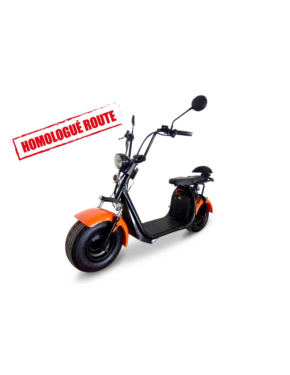 E-djam, le scooter électrique fun et original au look de chopper harley. Grâce à ses larges pneus, vous pourrez rouler sur tous types de terrains : sable, terre, boue, sable, gravier, neige... mais surtout sur la route ! Son prix est particulièrement attractif : seulement 1499 €. C'est actuellement le scooter électrique homologué route le moins cher du marché !Grâce à ses deux sièges, vous pourrez emmener quelqu'un derrière vous. Il est homologué au même titre qu'un scooter 50cm³ traditionnel. Vous pourrez donc rouler sur les routes à 45 km/h en toute légalité.