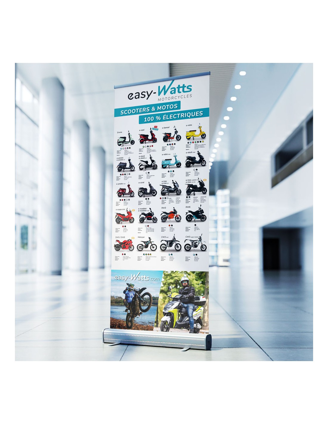 Le roll up est l’un des supports PLV le plus apprécié : compact grâce à son système enrouleur, il prend peu de place lors du transport et se monte très rapidement. Il prendra tout naturellement sa place dans votre hall à côtés de vos véhicules easy-watts. Possibilité de le personnaliser avec votre marque, des photos des véhicules que vous souhaitez, des prix, des informations particulières etc...